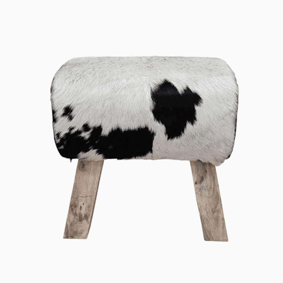 Naš omiljeni taburić „Kozlić“ dobio je jednog šarenog drugara čiji je sedalni deo presvučen kravljom kožom crno bele boje.
